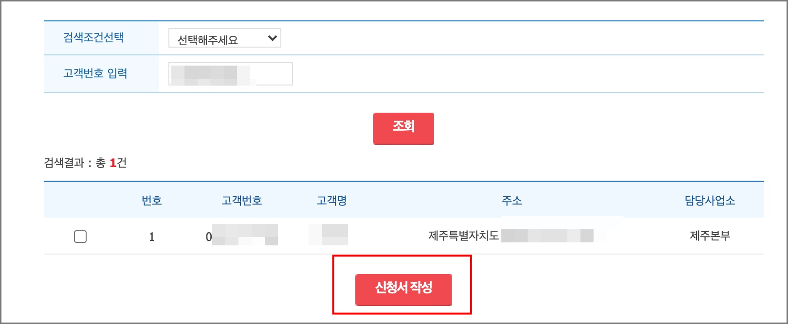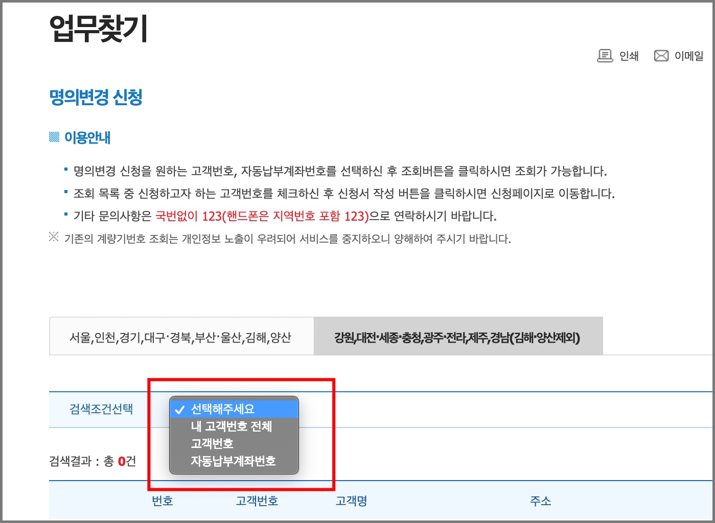 명의변경시 고객번호나 자동납부계좌번호를 선택하여 조회버튼을 클릭합니다.