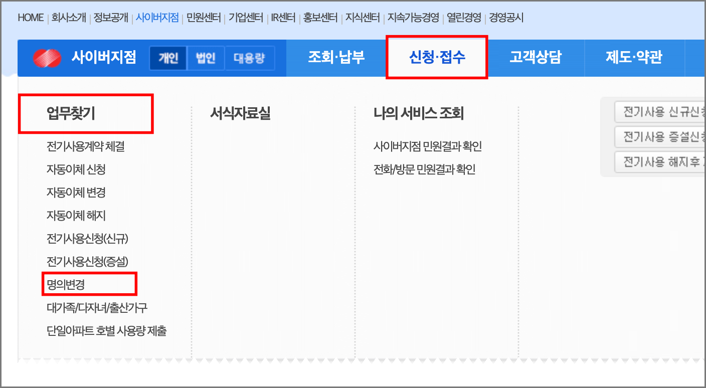 한전사이버지점 > 회원가입 > 신청·접수 > 업무찾기 > 명의변경