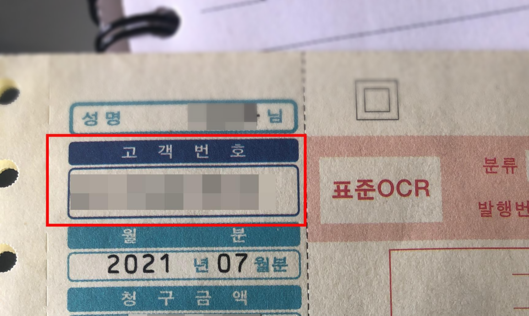 청구서의 고객성명 아래에 10자리 숫자의 고객번호를 확인할 수 있습니다.