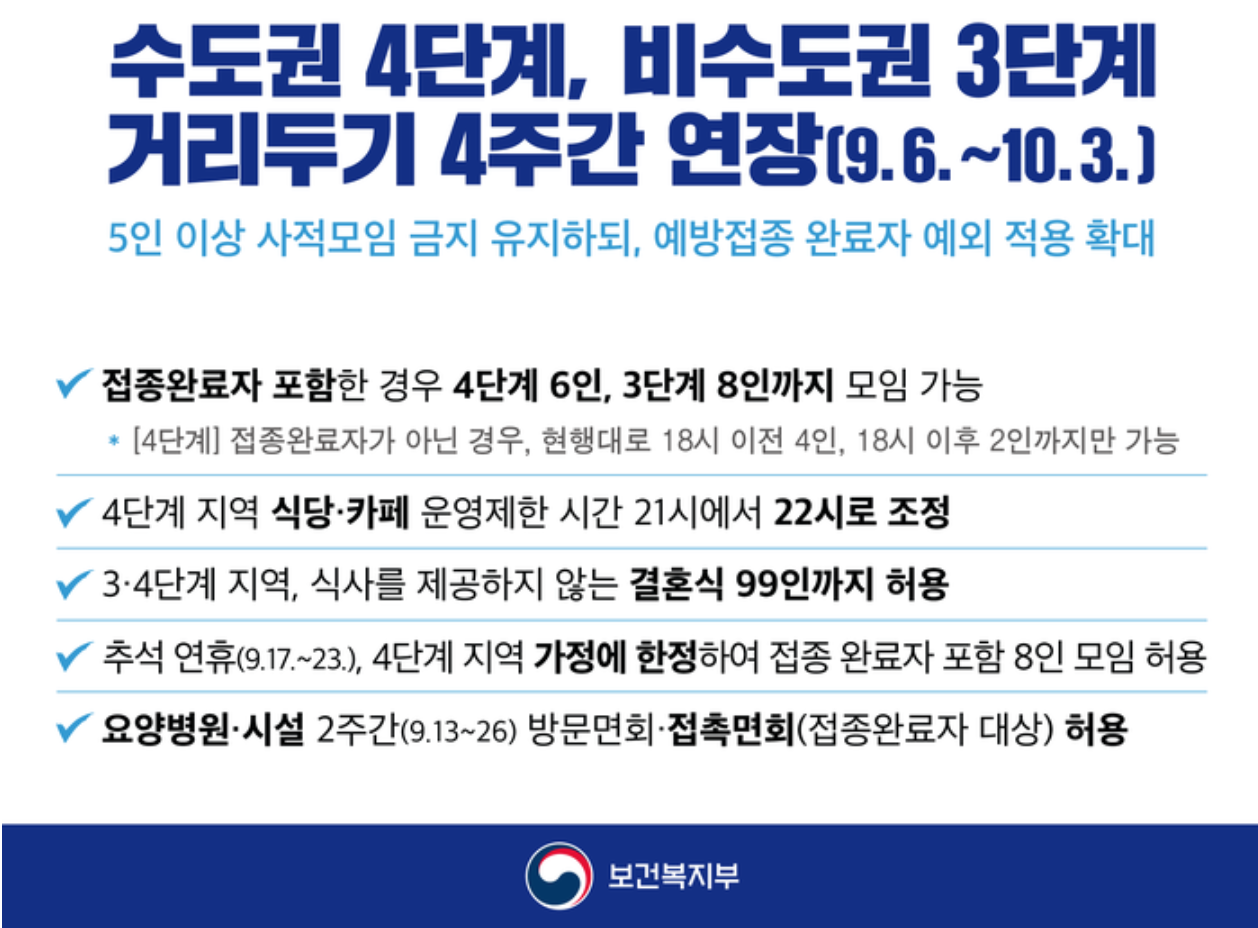 ✔️추석연휴(9.17~ 23), 4단계 지역 가정에 한정하여 접종 완료자 포함 8인 모임 허용