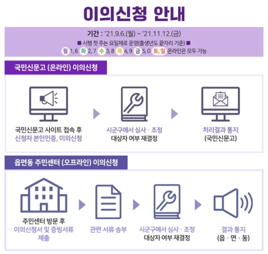 국민신문고 사이트 접속 후 신청자 본인인증, 이의신청 -> 시군구에서 심사. 조정 대상자 여부 재결정 -> 처리결과 통지(국민신문고)