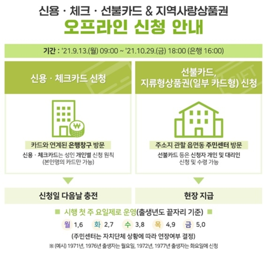 온라인 신청에서와 마찬가지로 오프라인 신청 첫 주인 9월 13일(월)~ 9월 17일(금)은 출생 연도 5부제로 운영됩니다.