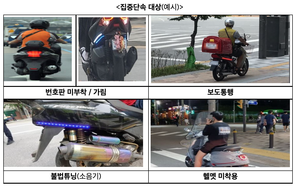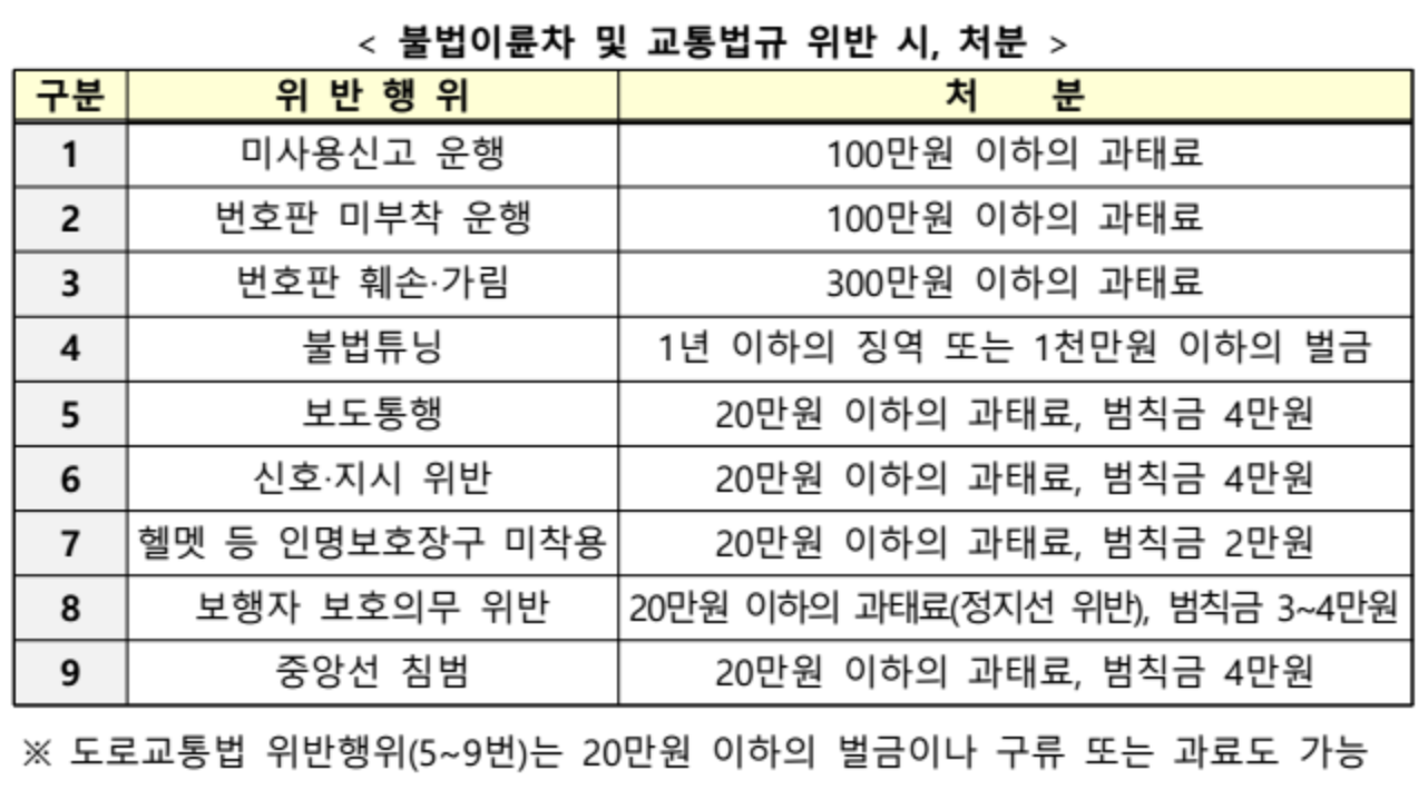 미사용신고(무등록), 번호판 미부착, 번호판 훼손 또는 가림, 불법튜닝(LED, 소음기 등) 등 - 「자동차관리법」을 위반한 이륜차