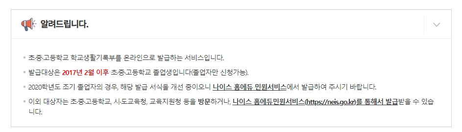 - 이외 대상자는 초·중·고등학교, 시·도교육청, 교육지원청 등을 방문하거나, 나이스 홈에듀민원서비스를 통하여 발급받을 수 있습니다.