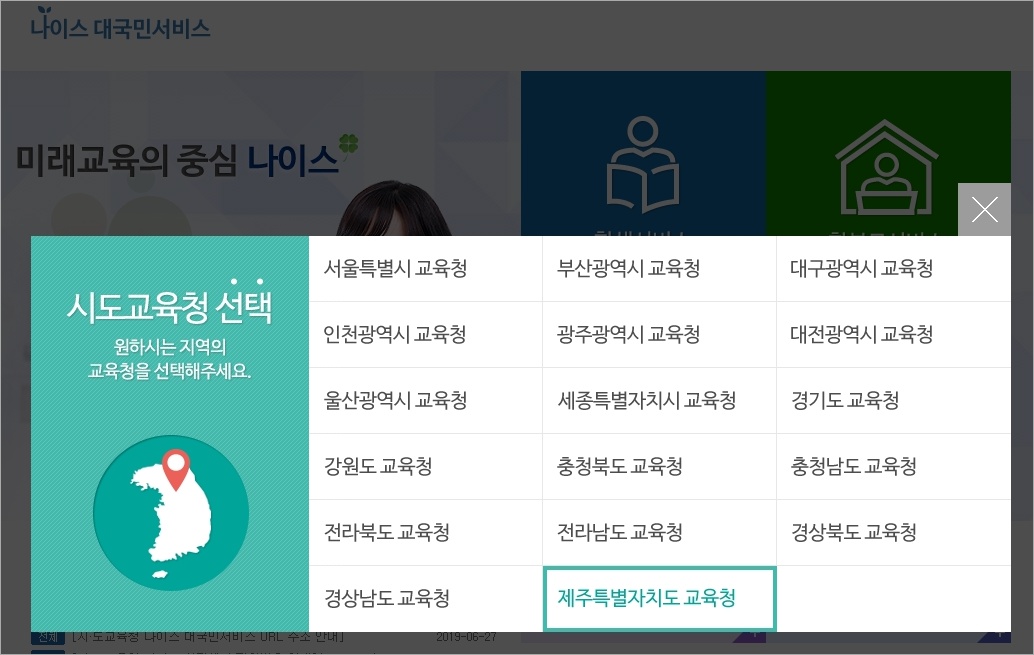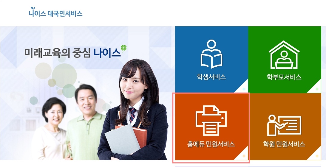 나이스 대국민 서비스 페이지에서 > 홈에듀 민원서비스로 들어갑니다.