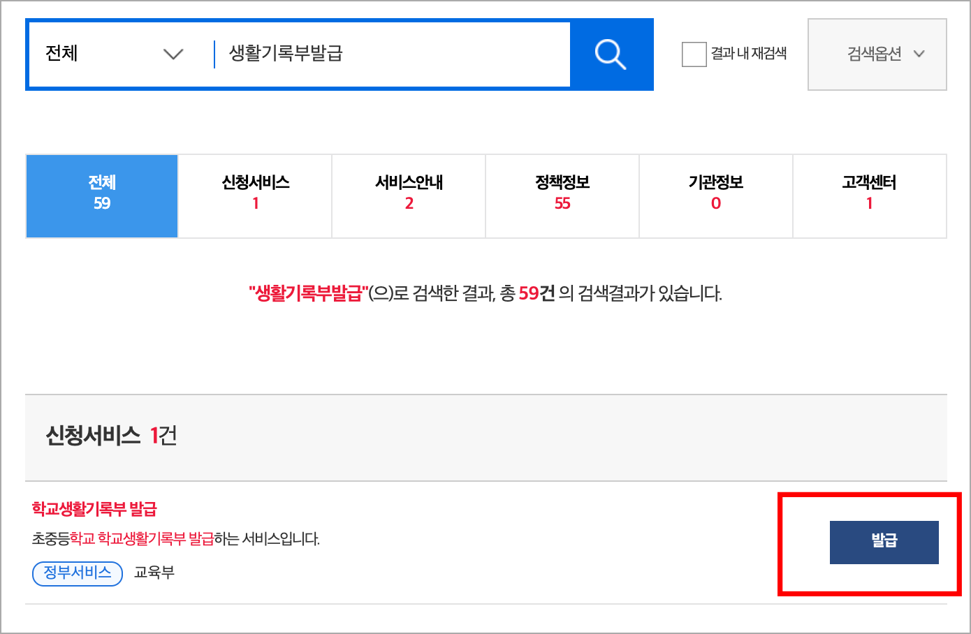 정부24 검색창에 생활기록부 발급을 검색하여 해당민원을 찾아서 신청해주시면 됩니다.
