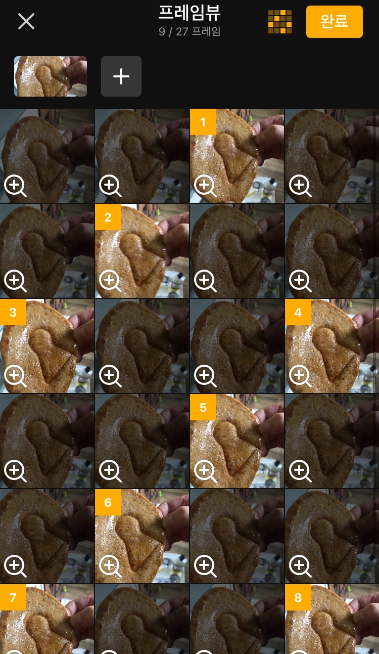 윗 부분을 보면 바둑판 모양의 아이콘은 현재 프레임 27컷 중에서 뺄것은 빼는 등 이미지를 선택할 수 있습니다.