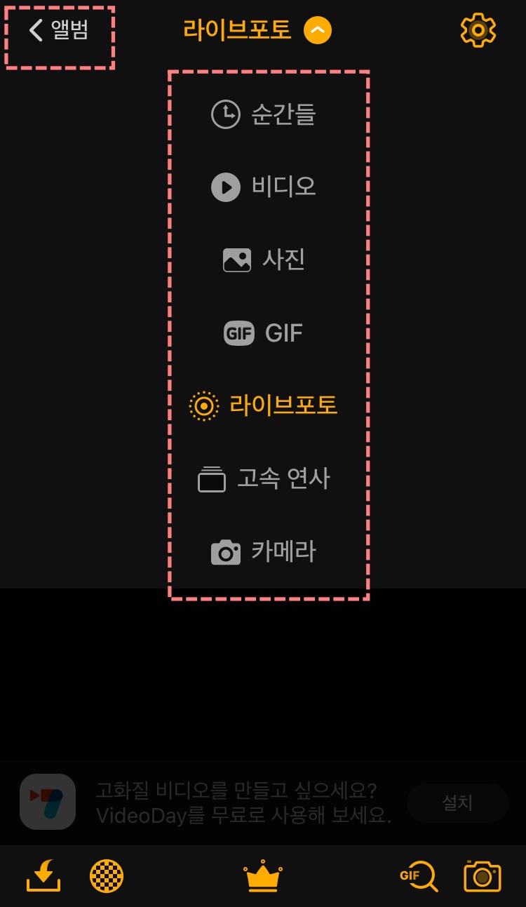 순간들, 비디오, 사진, Gif, 라이브포토, 고속연사, 카메라에서 선택합니다.