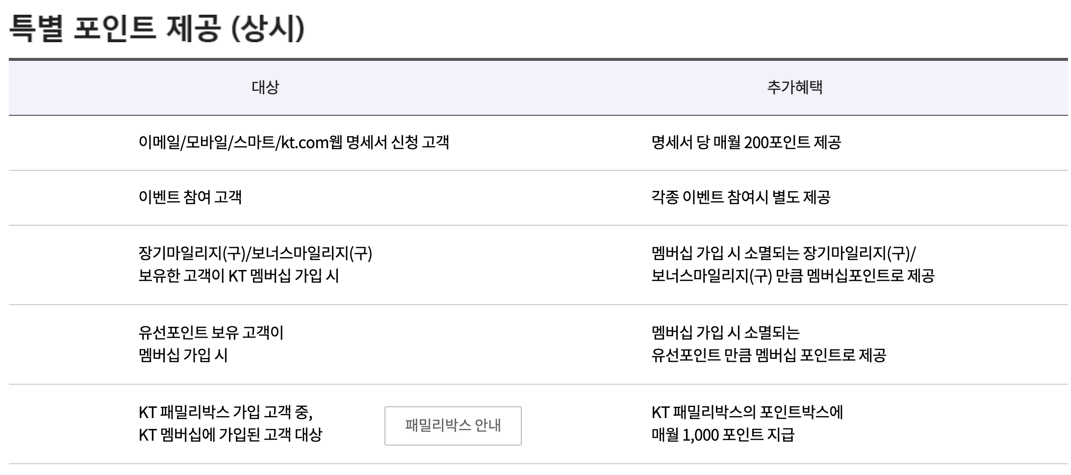 ▶ 케이티 패밀리 박스 가입 고객 중, 케이티 멤버십에 가입된 고객 대상 - 케이티 패밀리 박스의 포인트박스에 매월 1,000포인트 지급