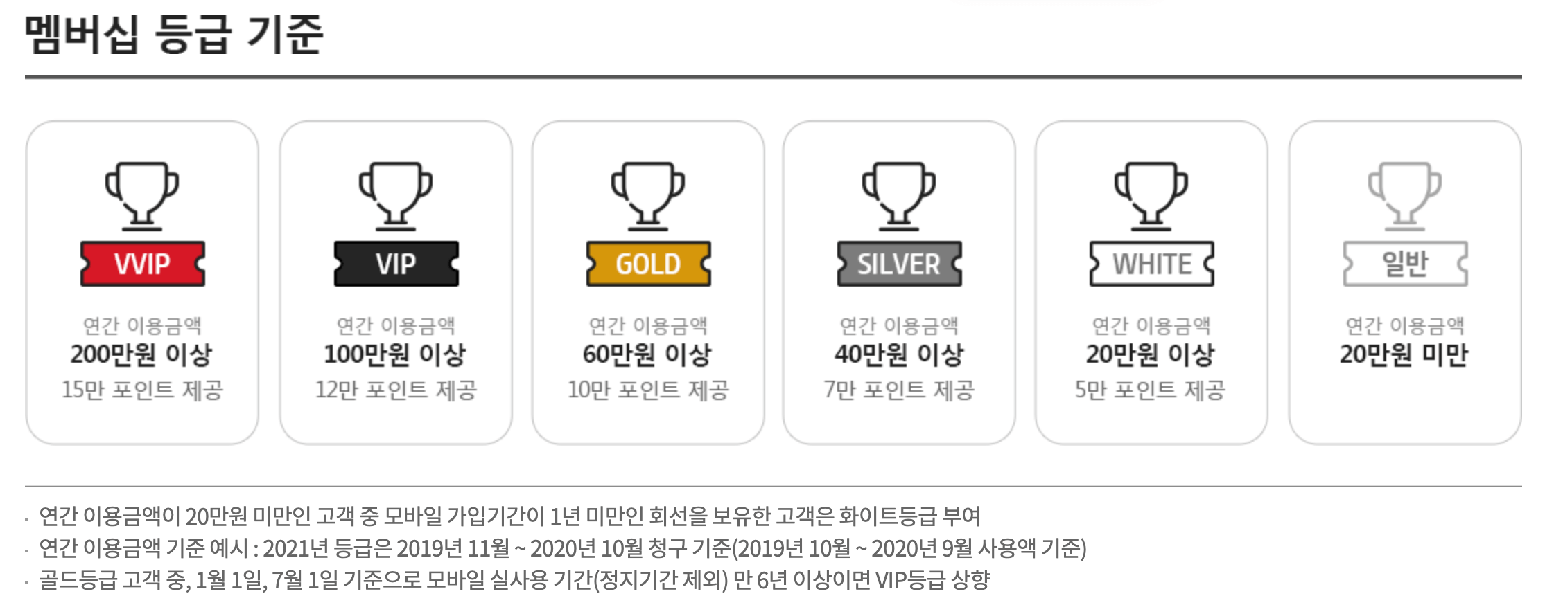멤버십 등급 산정을 위해 연간 이용되는 항목은 모바일 ,집전화 ,인터넷, 인터넷 전화, IPTV로