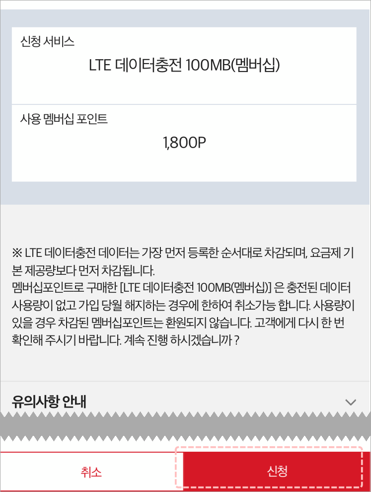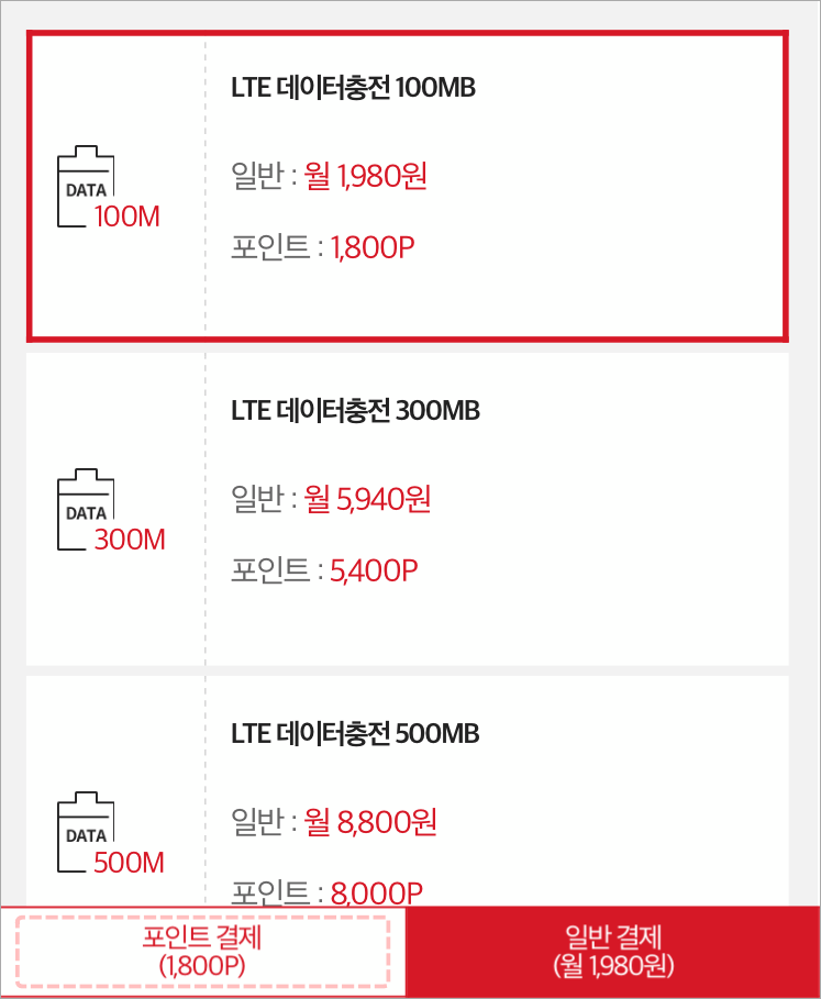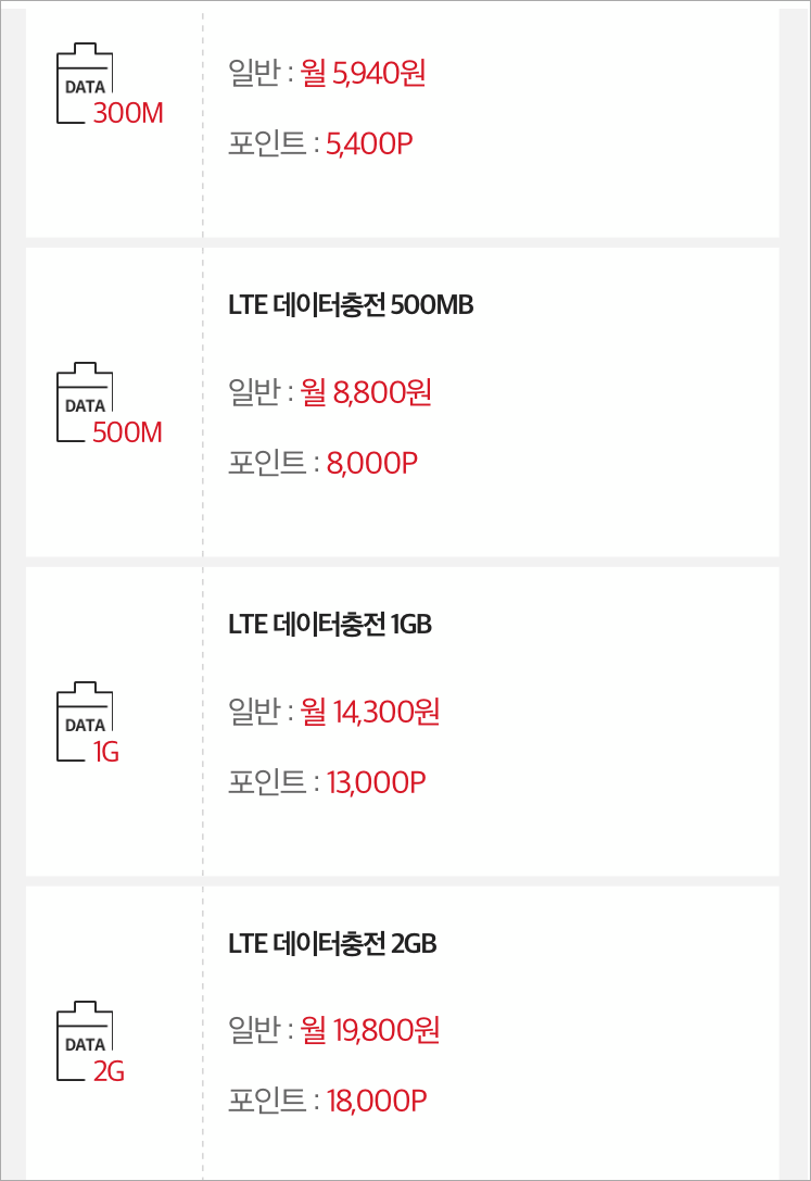 데이터 충전할 수있는 양과 그에 맞는 요금 및 포인트가 나옵니다.