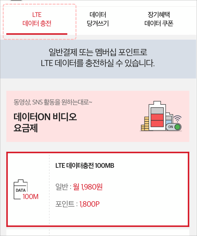 LTE의 경우 100M 부터 2G까지 충전이 가능합니다.