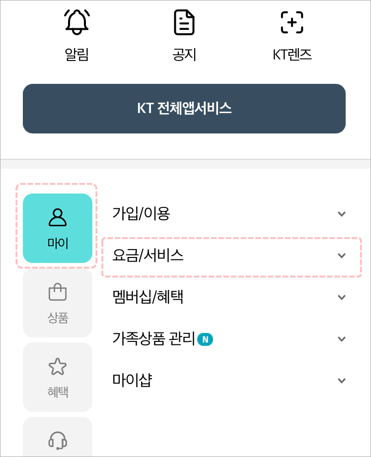 여기서 '마이' 클릭 하여 '요금/서비스'를 클릭!