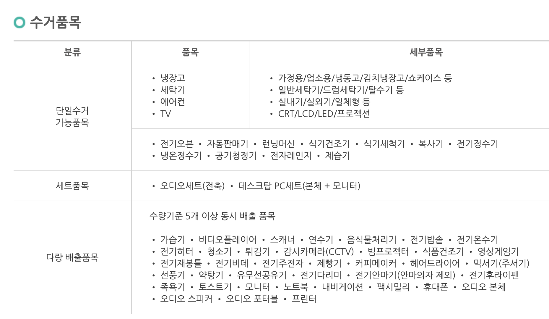 폐가전배출예약시스템 홈페이지에서 수거품목을 확인해보면~
