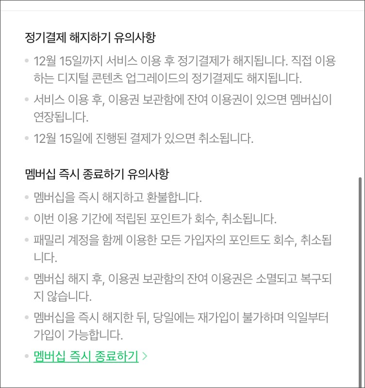 다만, 내가 받은 포인트도 뱉어내야 하는 것 같아요~ 저도 혜택을 받았으니 굳이 즉시종료하기 할 필요는 없고, 정기결제 해지하기를 하면 될 것 같아요~