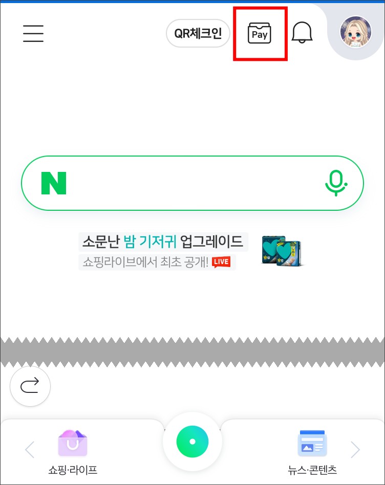 네이버앱으로 들어간 후, 네이버페이부분을 클릭해줍니다.