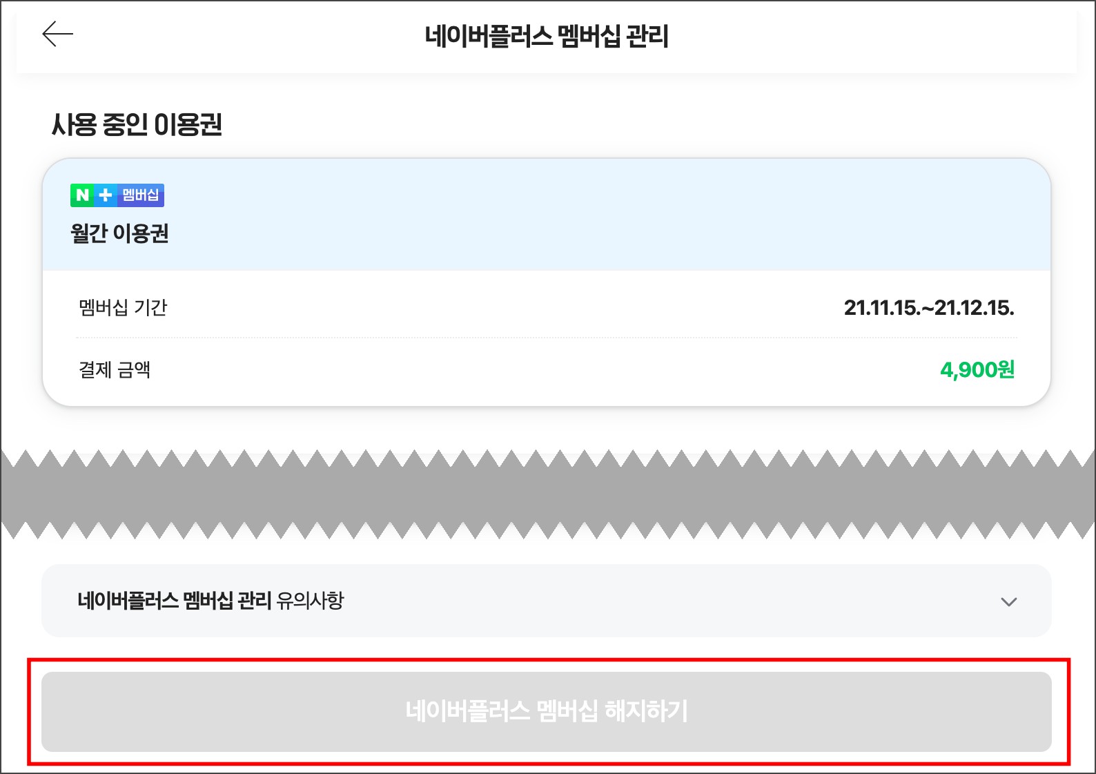 네이버플러스 멤버십 관리페이지에서 스크롤을 내리면 하단에 회색 박스로 네이버플러스 멤버십 해지하기 버튼이 있습니다.