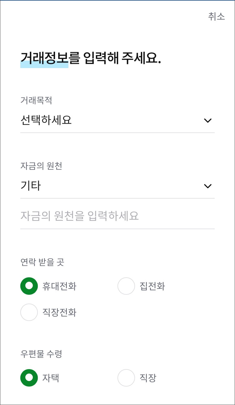 거래목적, 자금원천, 연락처 등.