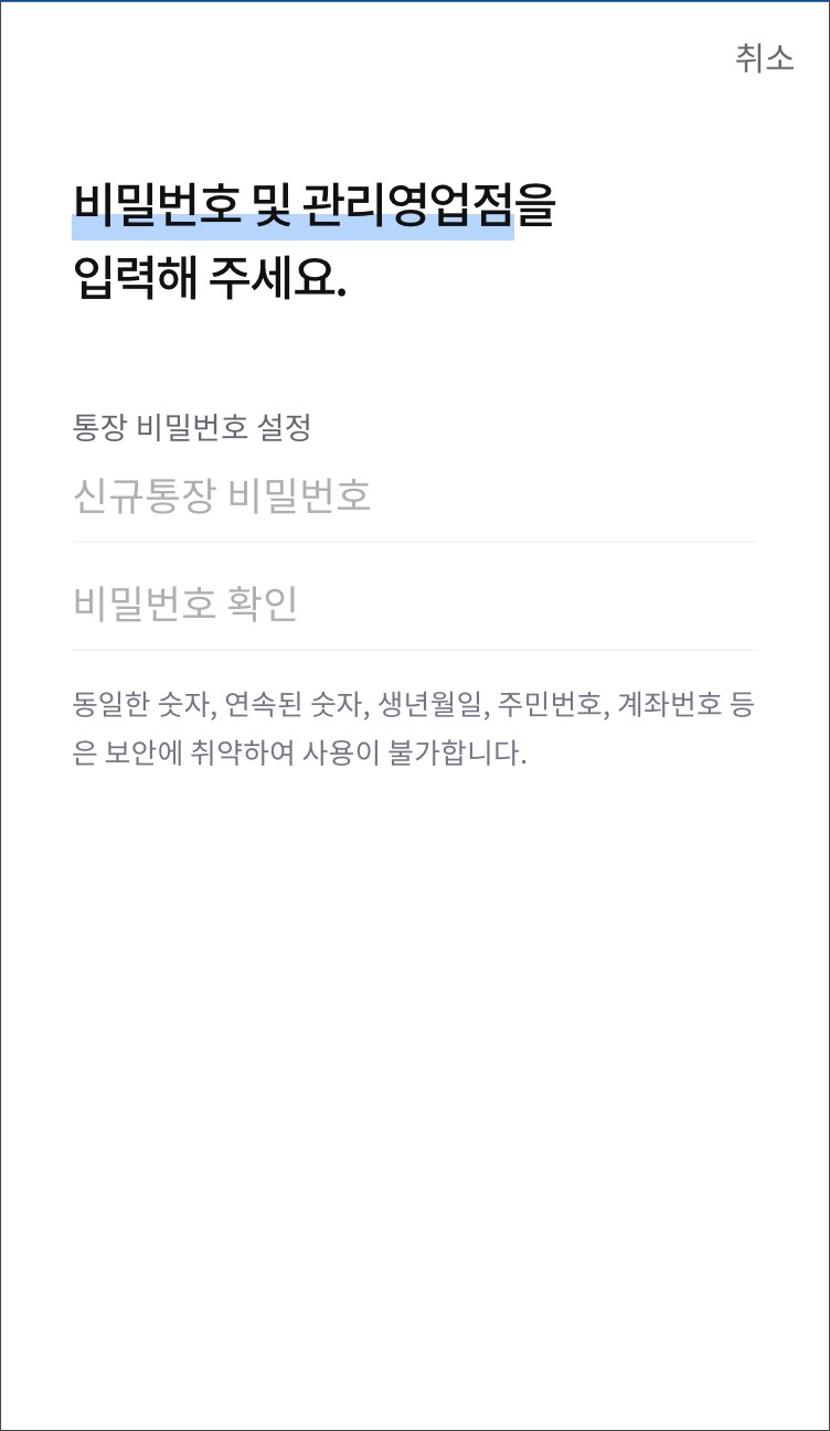 ✔️휴대폰 본인인증 -> 동의사항 확인 및 체크 -> 신분증 본인확인 -> 실명인증 -> 고객정보입력 -> 거래정보입력 -> 비밀번호 및 관리 영업점 입력 -> 비대면 계좌개설 완료!