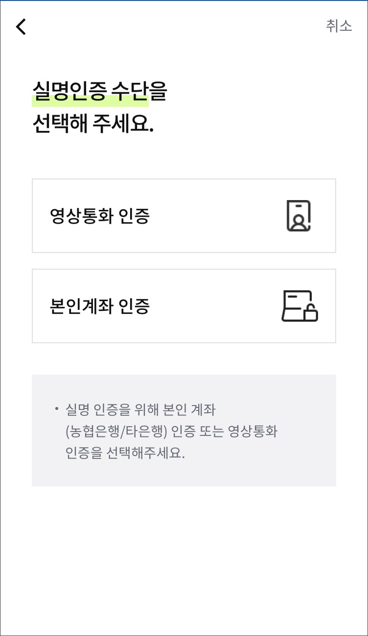실명인증은 영상통화인증, 본인계좌인증이 있습니다.