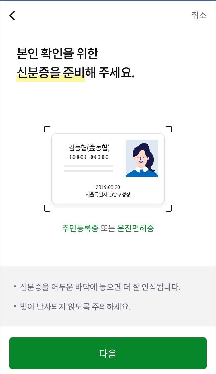 본인확인을 위해 신분증을 촬영해주어야합니다.
