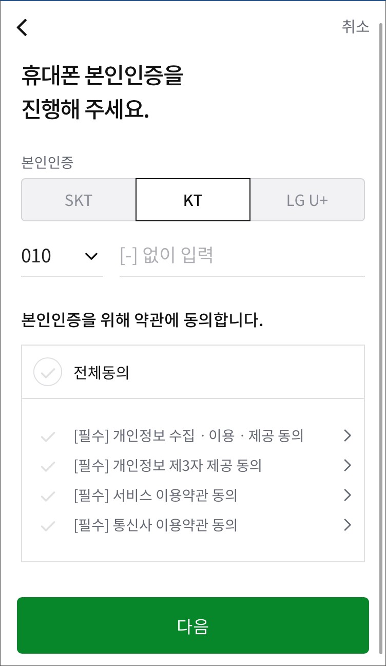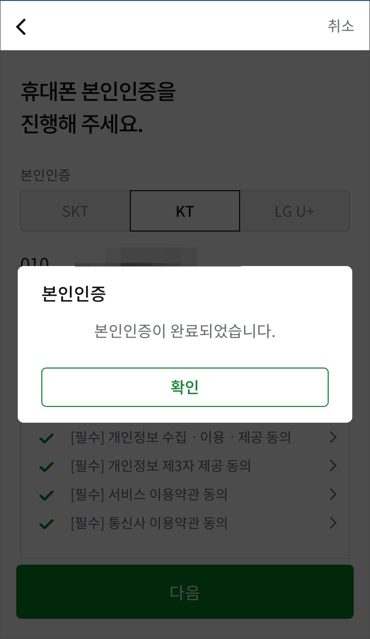 휴대폰 번호를 입력하고 본인인증을 위한 약관에 동의하여