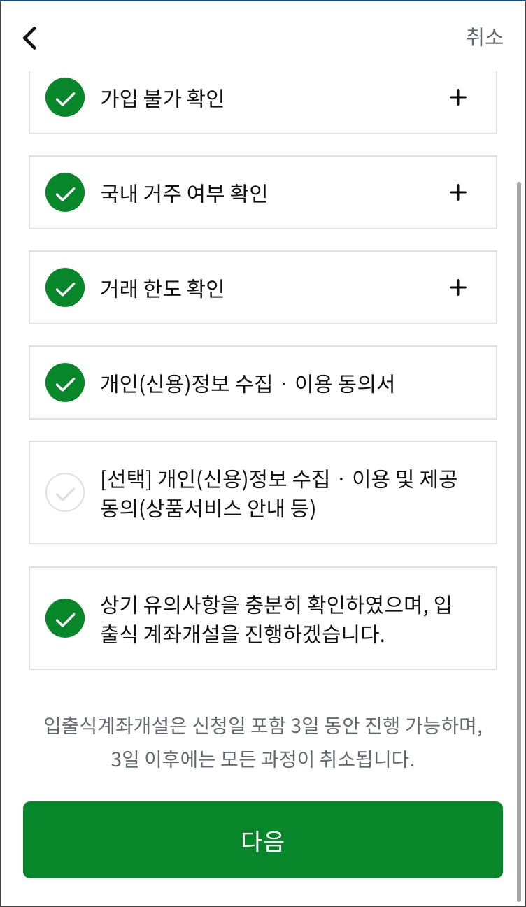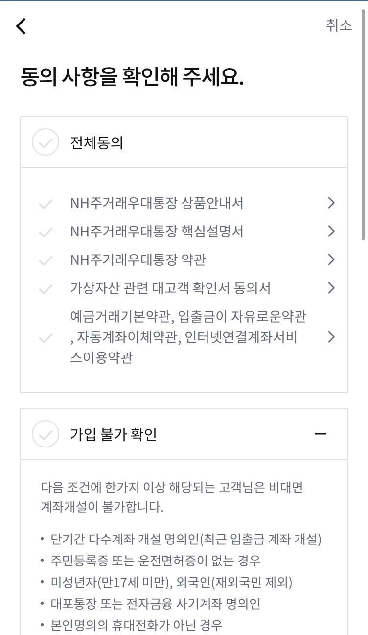 상품에 대한 설명, 가입불가확인, 거래한도 확인, 개인정보수집이용 동의서 등에 동의해야합니다.