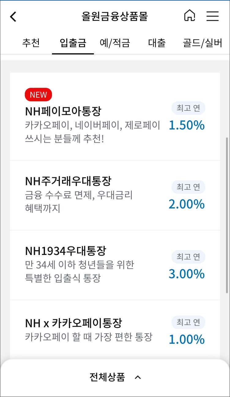 농협은행 간편뱅킹 어플인 올원뱅크에서도 비대면 계좌를 개설할 수 있는데요~ 입출금 계좌 뿐 아니라, 예적금, 대출상품등도 가입할 수 있습니다.