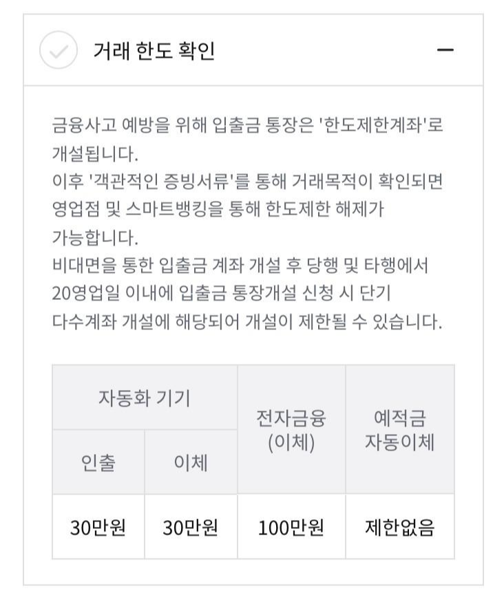 또한, 입출금 계좌는 '한도제한계좌'로 만들어지게 되는데요~ 1일 100만원의 한도가 붙습니다. (ATM 30만원)