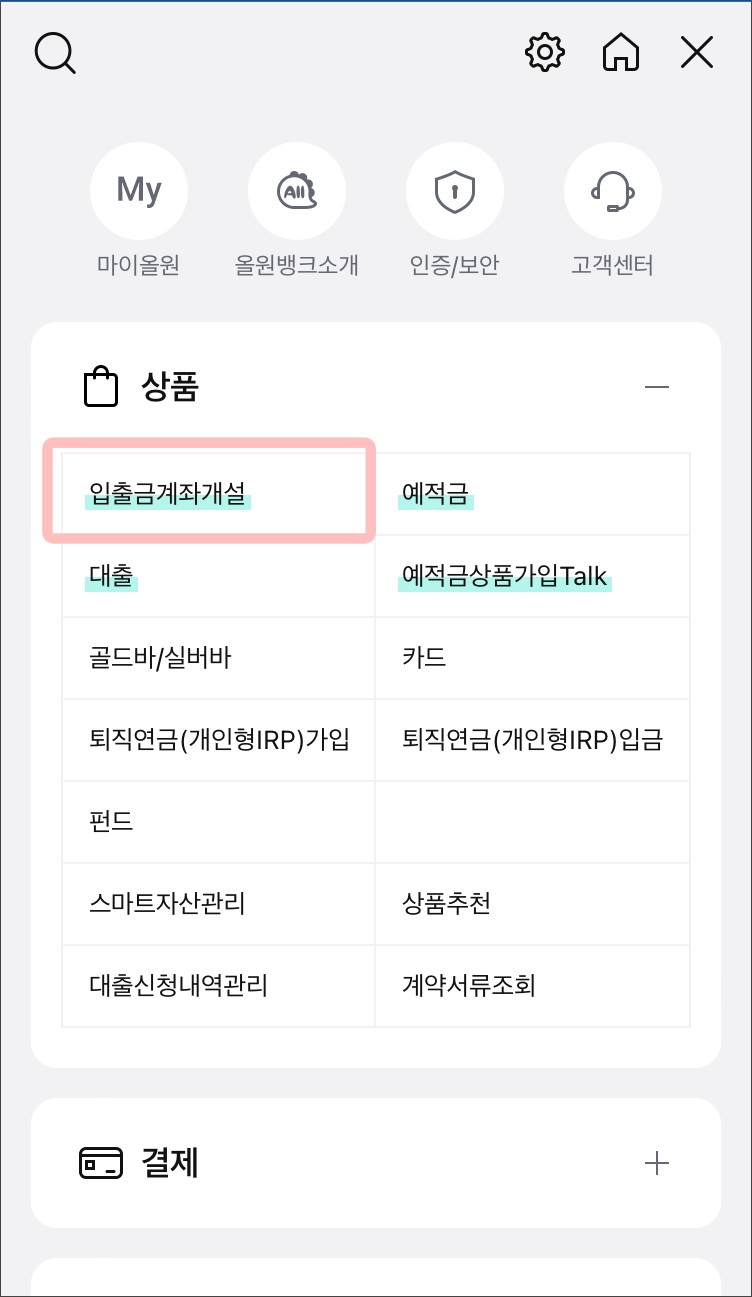 ✔️메뉴 -> 입출금 계좌개설 -> 입출금 통장 중 마음에 드는 상품을 선택하여 신청하기