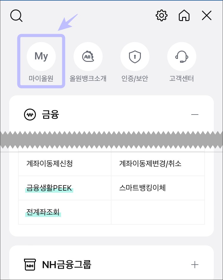 올원뱅크 앱으로 들어가 로그인한 후, 상단 우측 삼선아이콘(≡) 클릭합니다.