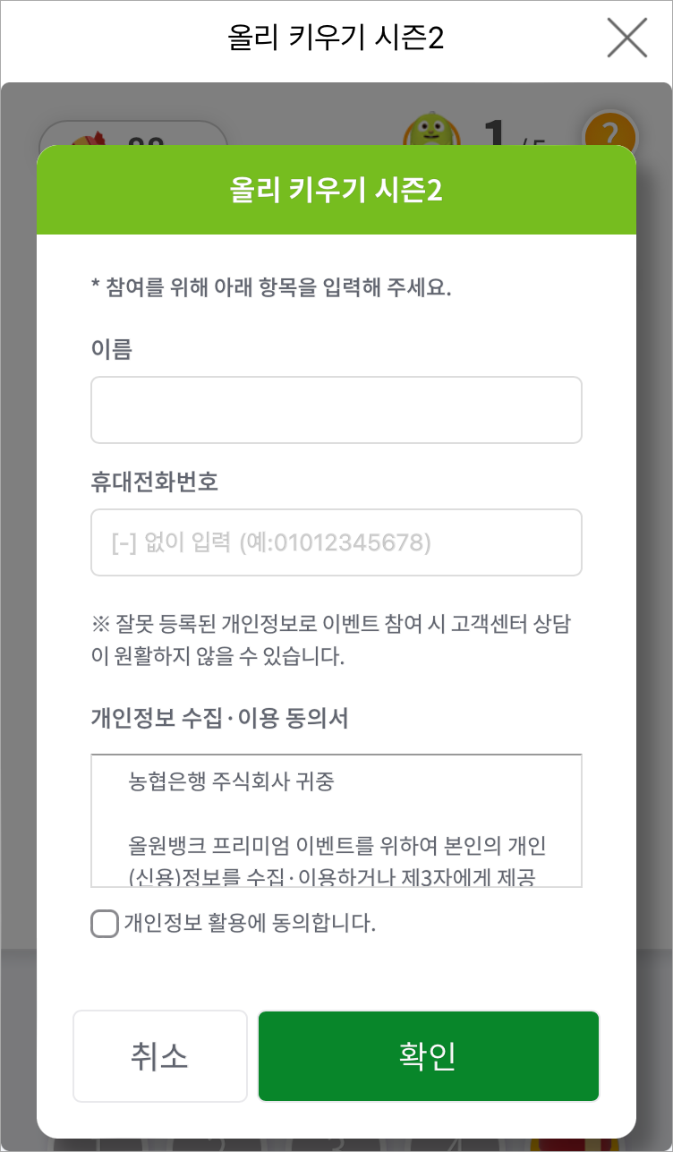 참여를 위해서는 역시 이름과 휴대폰 번호입력하고, 개인정보수집에 동의해야하네요~