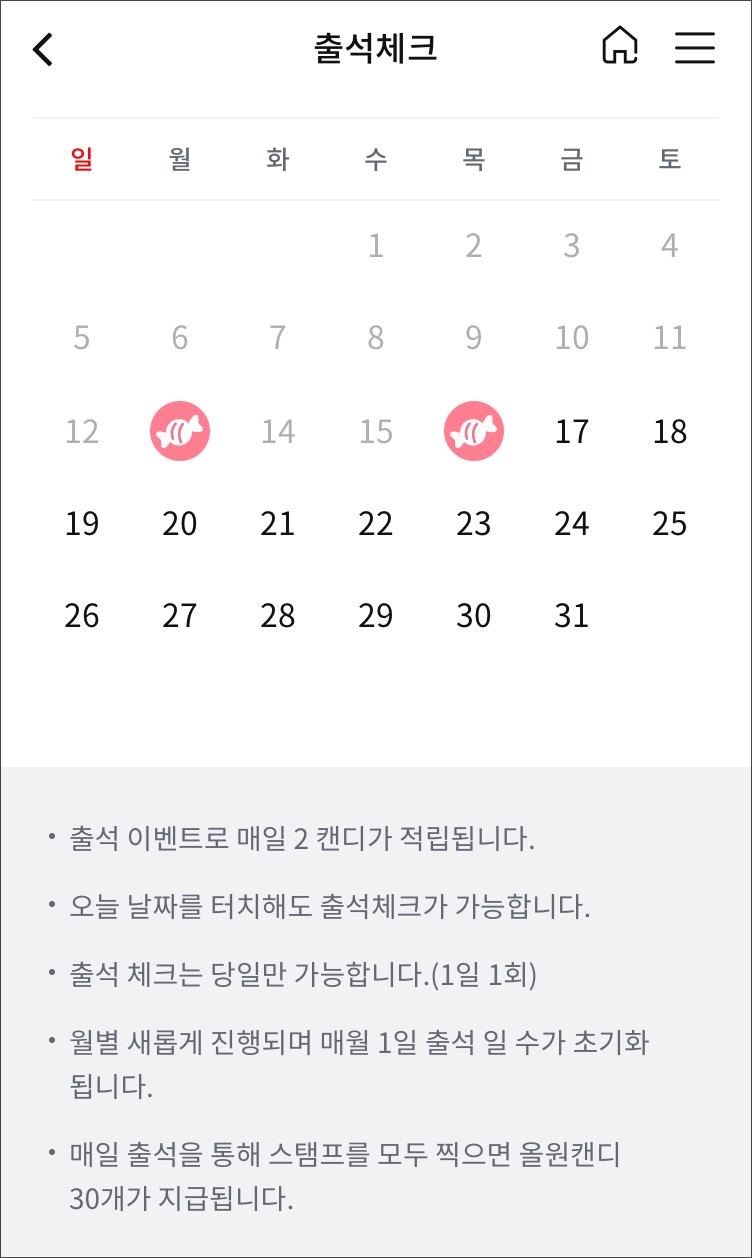 어떤 달에는 커피이벤트가 있었다고 하던데, 이번달엔 그냥 출석한 날마다 2캔디 적립이네요.