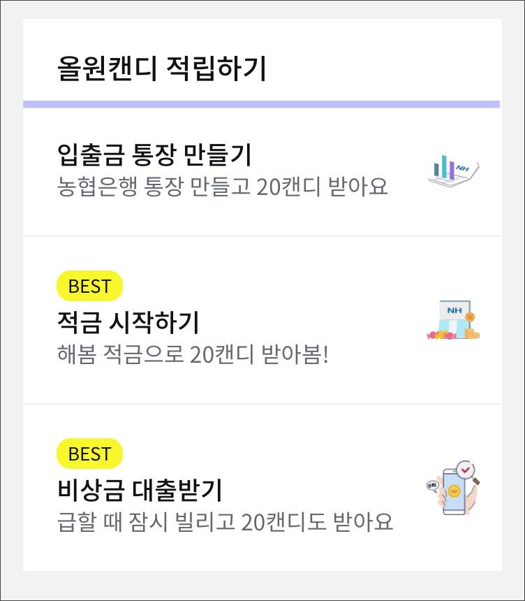 올원뱅크 농협은행앱에 캔디라는 것이 있더군요~ 캔디가 뭘까, 어떤 혜택이 있을까, 궁금하여 찾아보았습니다.