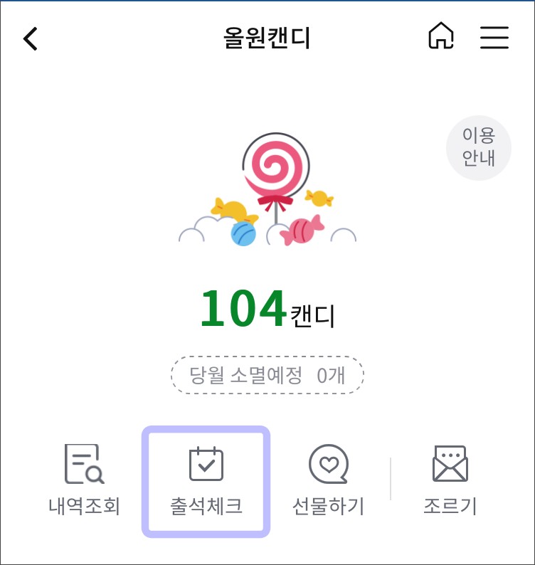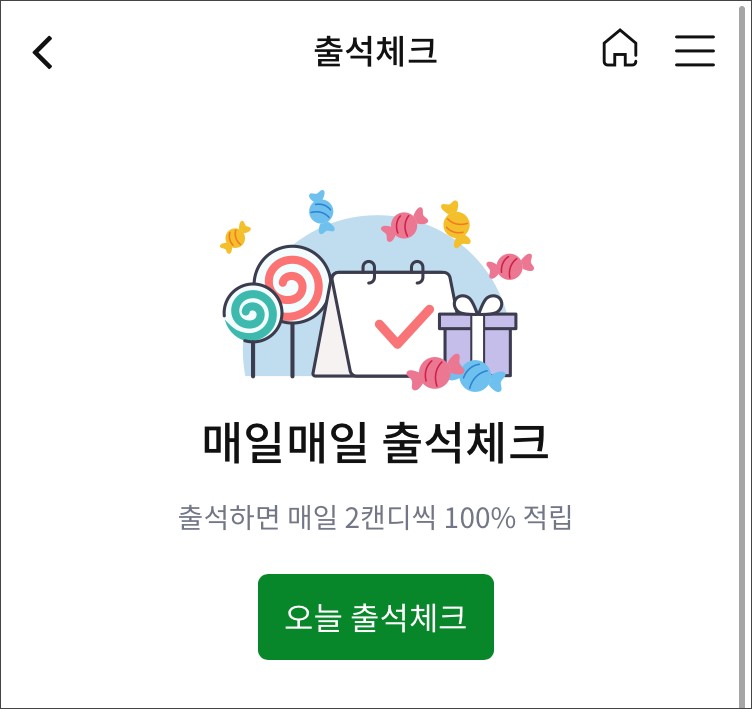출석체크를 통하여 캔디를 모을 수 있어요.