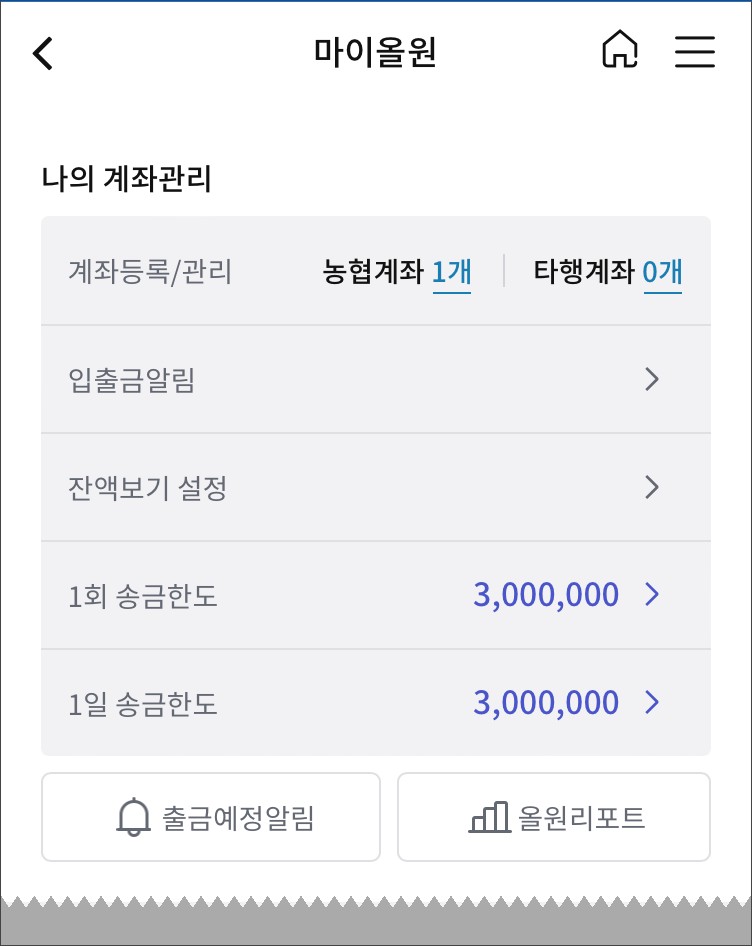 마이올원에서는 나의 올원캔디 뿐 아니라, NH포인트, 올원뱅크에 등록된 농협계좌 및 타행계좌, 송금한도등을 확인할 수 있습니다.