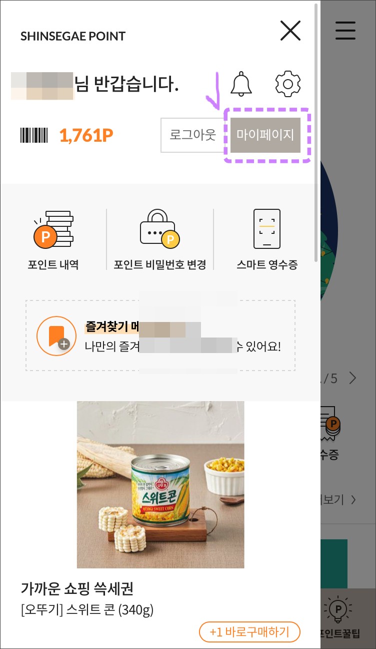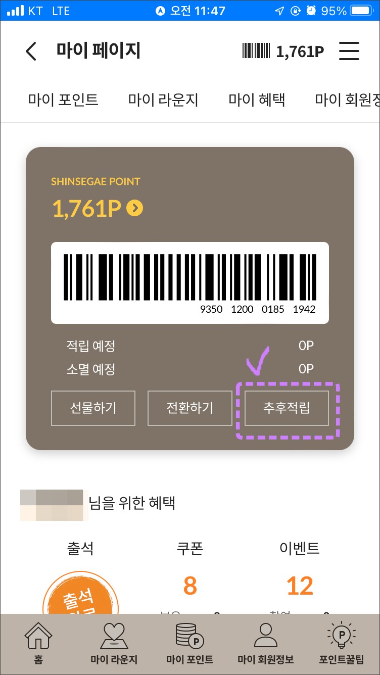 신세계포인트 바코드 밑으로 추후적립이라고 있습니다. 클릭!