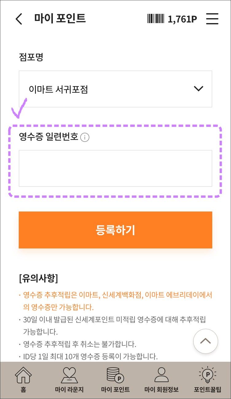 그때 그때 바로 바로 적립하는게 가장 경제적인 방법이지만, 잊어버리거나 정신없어서 놓치는 경우도 있죠~ 이럴땐, 영수증으로 집에 와서라도 포인트 적립 잊지말고 하세요~