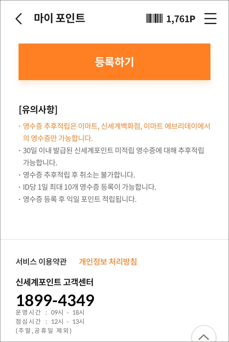 신세계포인트앱에서 결제한 영수증을 통해 포인트 추후적립이 가능합니다.