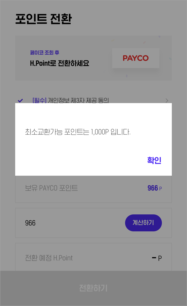 윽, 페이코 포인트는 1000포인트 단위로 전환이 가능하네요~