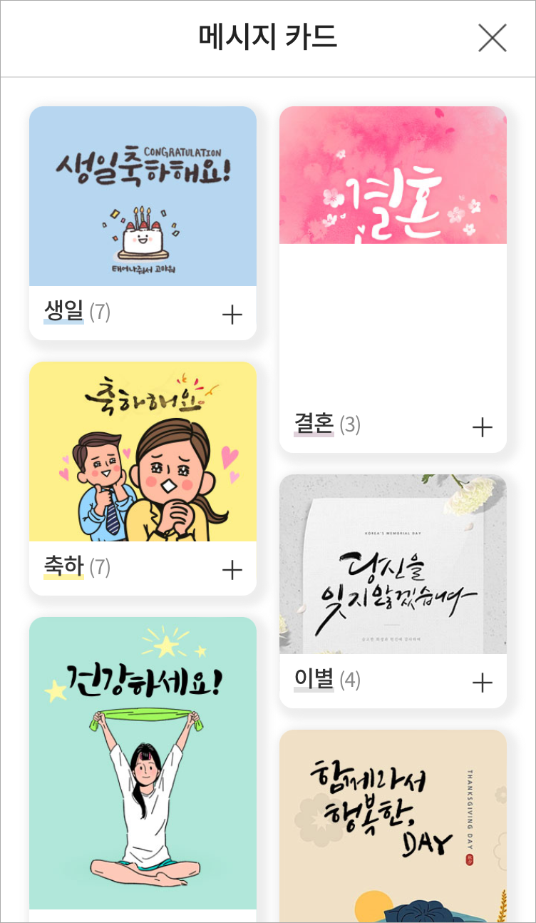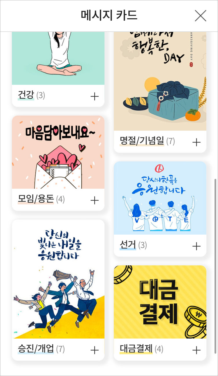 카카오톡 메시지카드를 선택하면 아래와 같은 메시지카드를 선택할 수 있습니다.