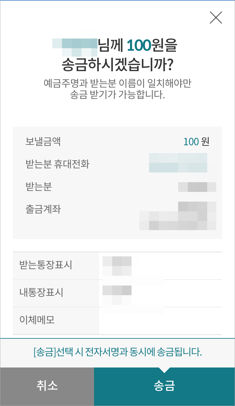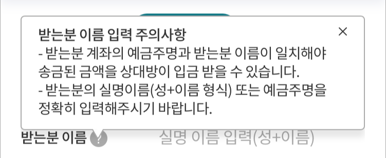 ☆ 받는 사람 계좌의 예금주명과 받는 사람의 이름이 일치해야 송금된 금액을 상대방이 입금받을 수 있습니다.☆