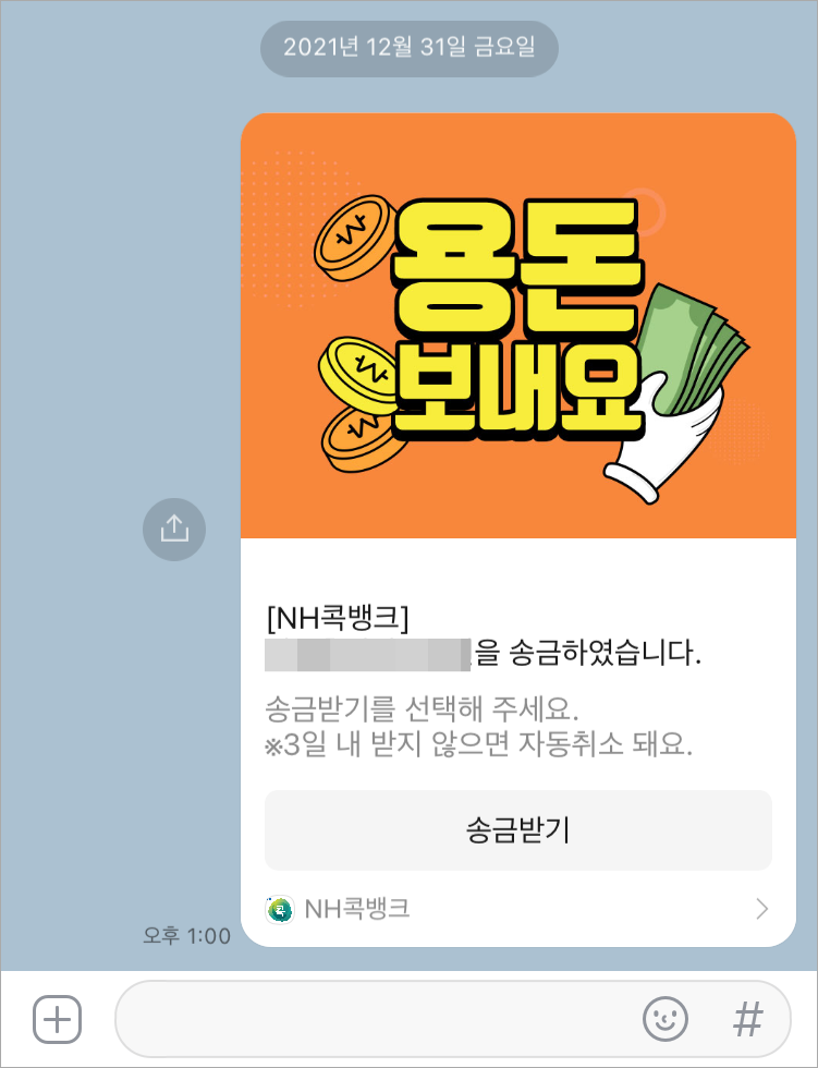 받는 분은 메시지받기를 통해 송금받기가 가능한데요~ 3일이내에 받을 계좌를 입력하지 않으면 송금이 자동으로 취소됩니다.