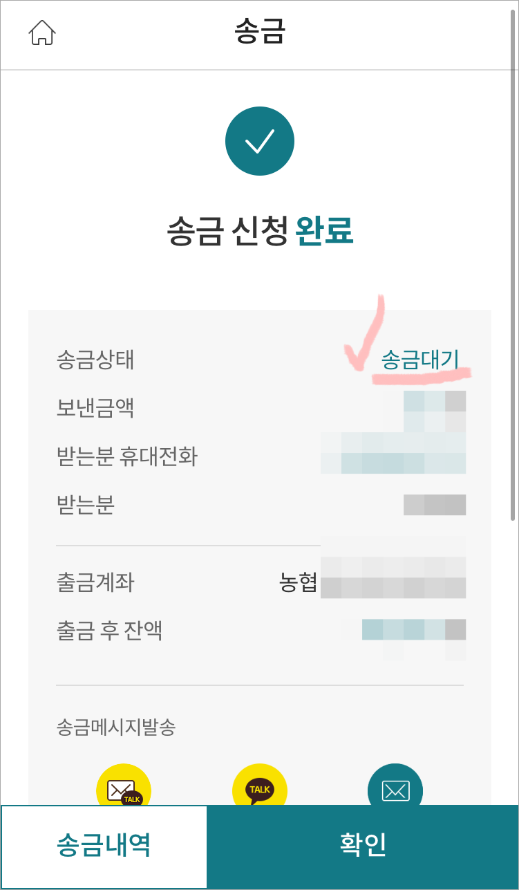 송금완료가 되었는지, 아직 대기상태인지 확인가능하고,