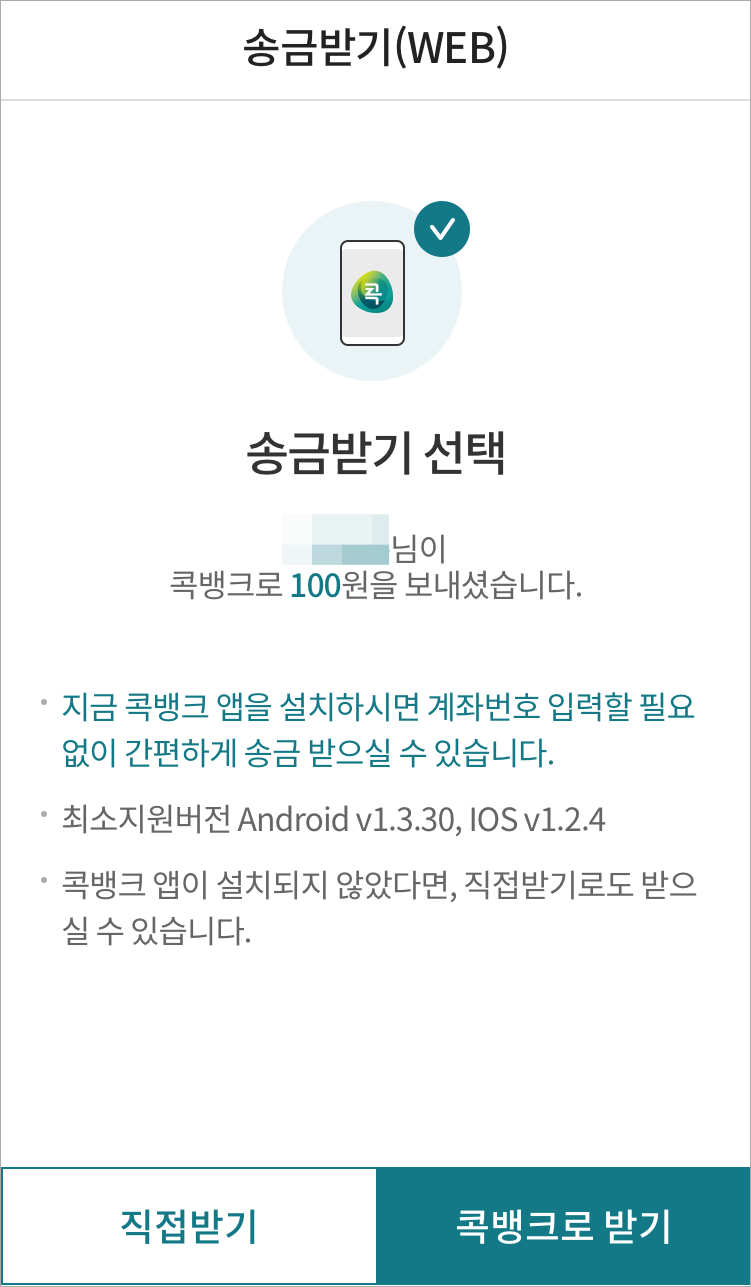받는 사람이 송금받기를 클릭하면 콕뱅크앱이 있는 분이라면 콕뱅크받기로 받을 수 있고,