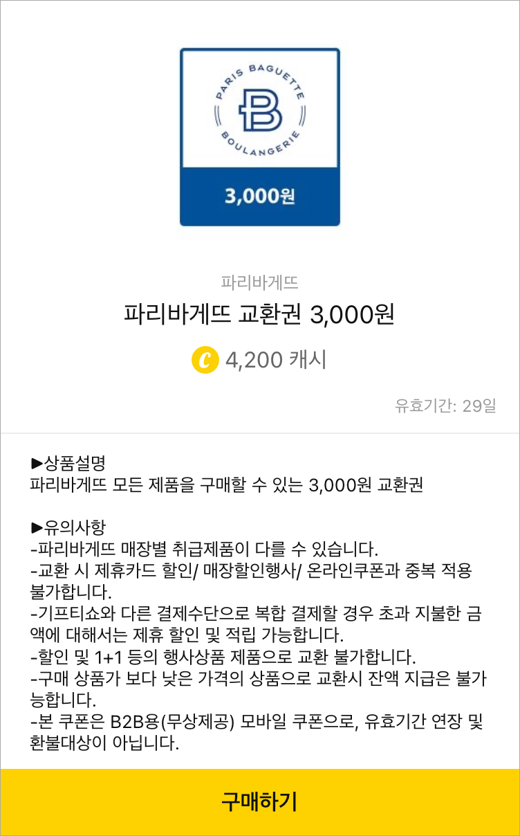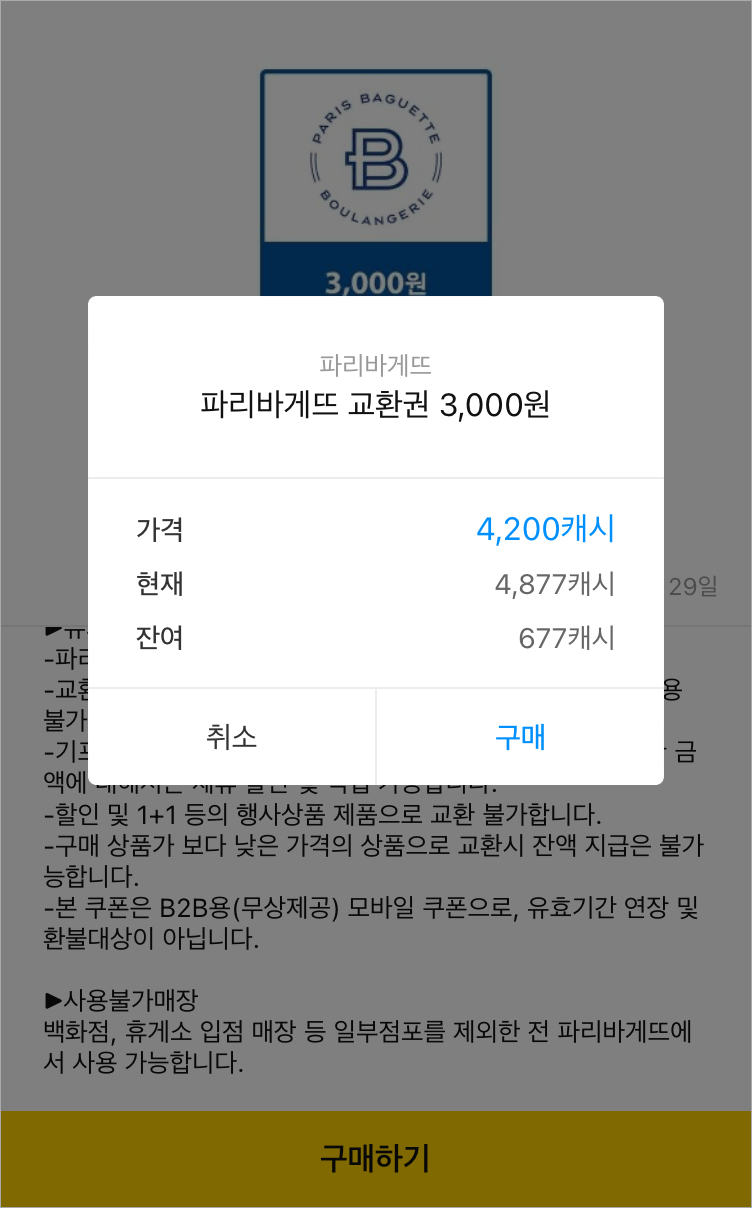 저는 4877캐시가 있어서 4200캐시로 살 수 있는, 파리바게뜨 교환권 3,000원 권을 구매하려고 합니다.
