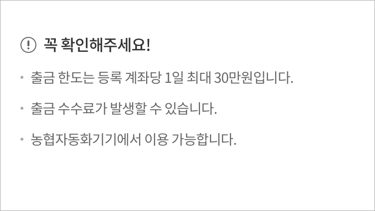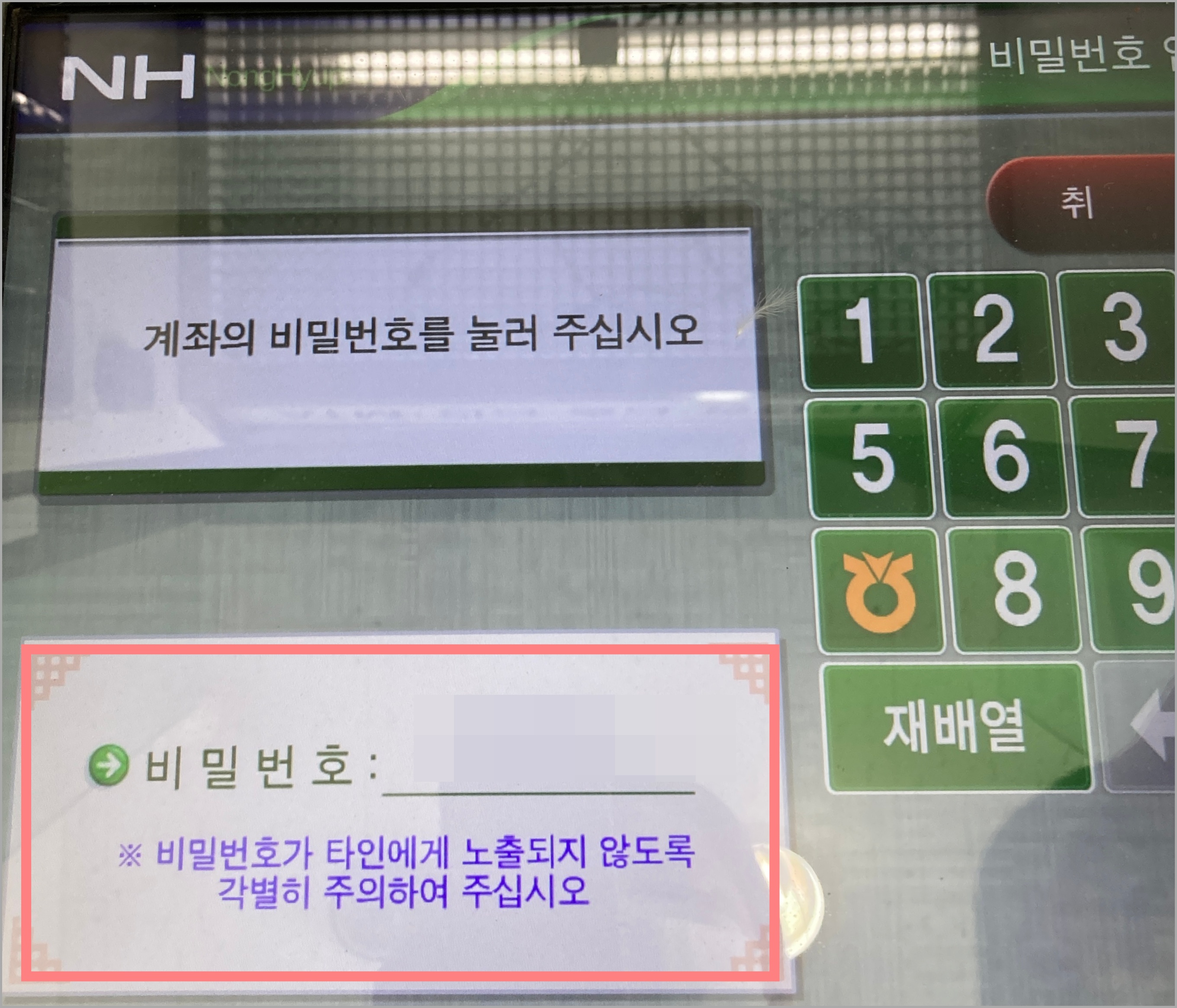 - 농협 자동화 기기에서 생년월일(6자리), 콕뱅크에서 받은 인증번호, 비밀번호 입력하기