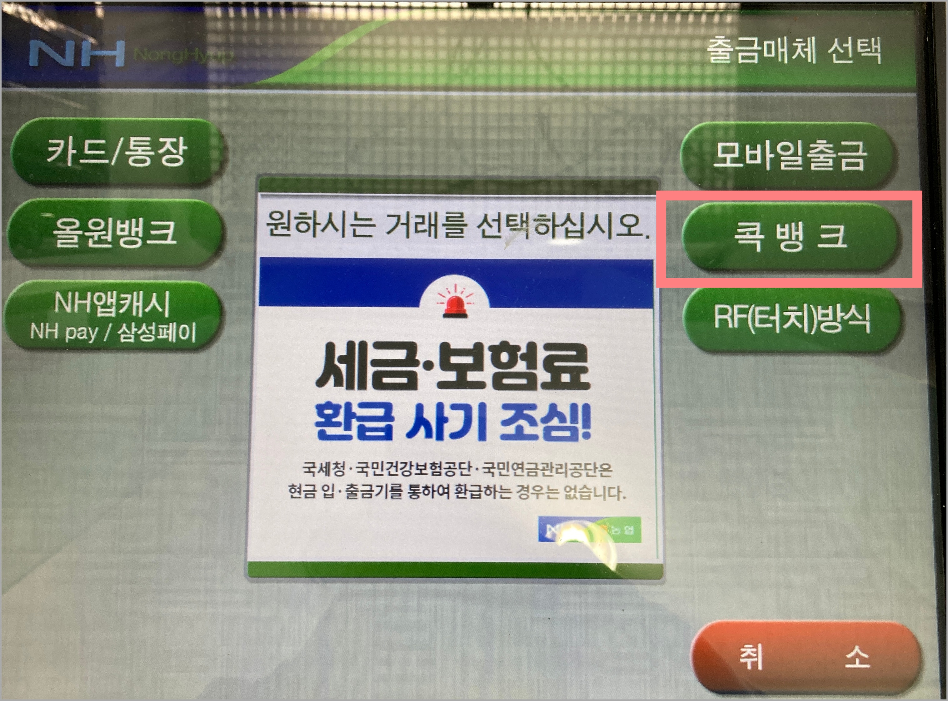 콕뱅크앱에서 인증번호를 받은 후에 ATM기기에 입력해 주는 방식입니다.