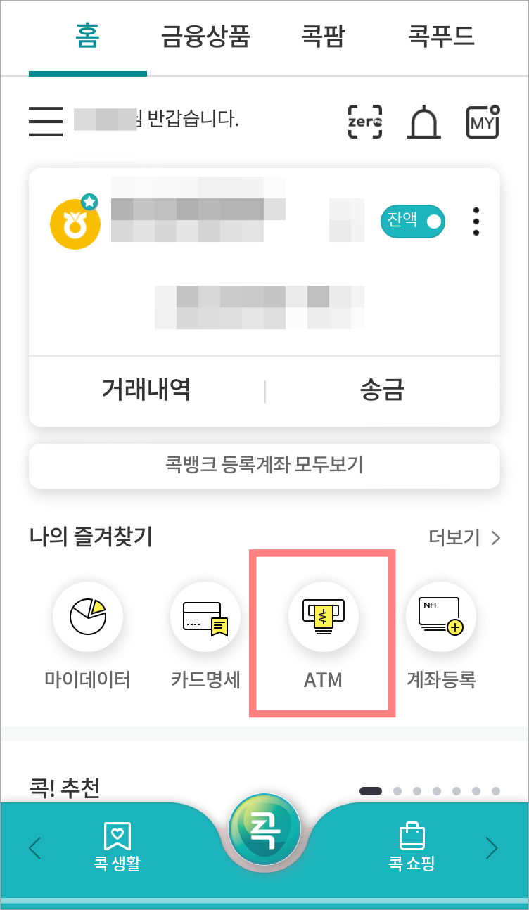 먼저, 콕뱅크앱으로 들어간 후~ ATM부분을 클릭합니다.