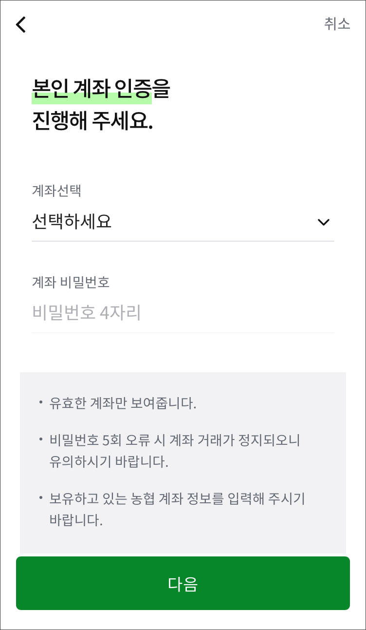 보유하고 있는 농협계좌 정보에서 유효한 계좌가 보여지면 선택하고